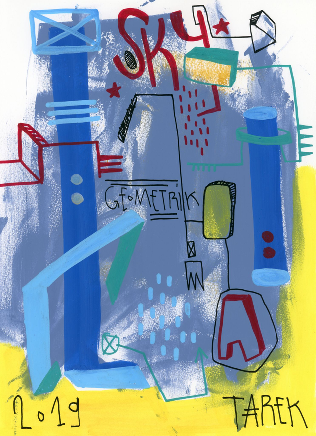 Poscas sur papier 21x29,7cm, 2019 // La série Abstract permet à Tarek d'explorer toutes les possibilités graphiques de l’art géométrique qu’il soit d’inspiration amérindienne, arabe, pythagoricienne ou encore post-moderne. Il a choisi de poursuivre sa prospection picturale dans de nouvelles voies où la couleur devient le thème central. Tarek a toujours été attiré par le travail de Miro, Kandinsky, Klee, Klimt, Malevitch, des Constructivistes, du Cubisme et, bien sûr, de Mondrian. La plupart des œuvres ont été peintes avec de l’acrylique et du Posca. La lumière prend toute sa place dans cette nouvelle série.