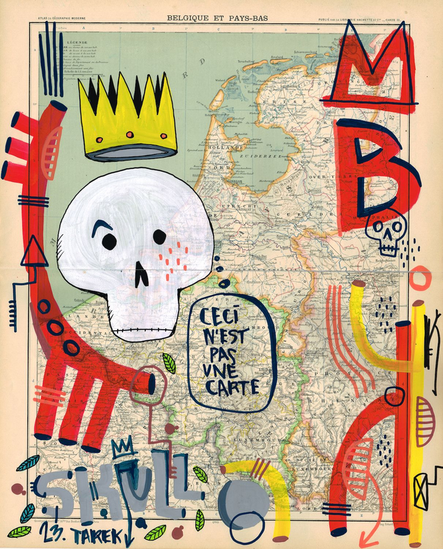 Poscas sur une carte ancienne datant de 1898, 46,7x37,5 cm, 2023 // Vincit Omnia Vanitas est une série qui regroupe une partie des œuvres de Tarek consacrée aux Vanités, aux "Skull" et aux crânes dans des mises en scènes modernes. Durant une dizaine d'années, il a collé régulièrement des skulls customisés mis en couleur dans les villes où il se rendait… Les collages de Skulls ont été posés dans la rue en plein jour. Chaque objet peint était signé. Avant le collage, une photographie de l’objet était systématiquement prise dans un endroit avec un minimum de mise en scène. Villes où des collages ont été effectués : France (Agen, Arras, Bourges, Chauny, Gentilly, Ivry-sur-Seine, Laval, Lorient, Lurcy-Levis, Marseille, Merlieux, Montrouge, Moulins, Niederbronn, Pacé, Paris, Puteaux, Rennes, Saint-Malo, Saint-Denis, Saint-Ouen et Valenciennes), Athènes, Bruxelles, Montréal, New York et Rabat. Ainsi, il a naturellement décliné cela en peinture et en dessin.