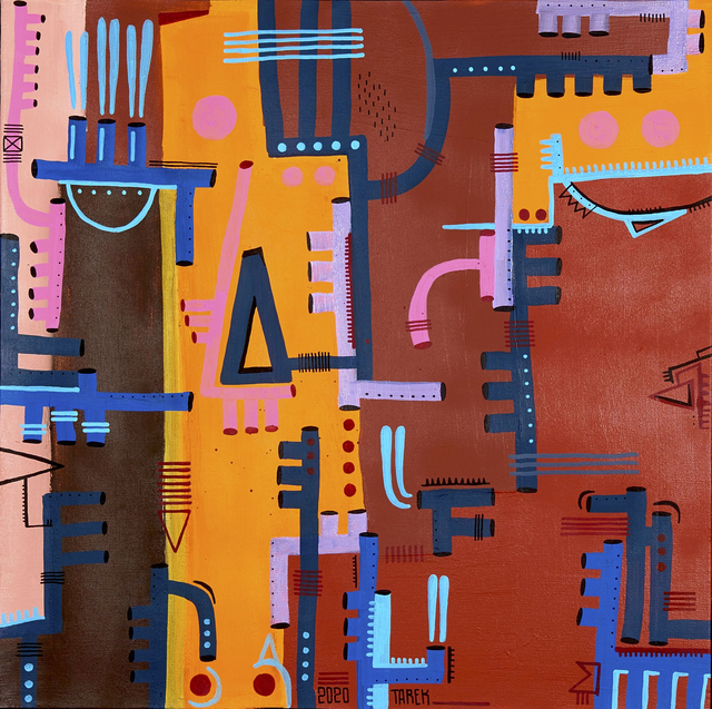 Acrylique et poscas sur Toile 60x60cm, 2020 // La série Abstract permet à Tarek d'explorer toutes les possibilités graphiques de l’art géométrique qu’il soit d’inspiration amérindienne, arabe, pythagoricienne ou encore post-moderne. Il a choisi de poursuivre sa prospection picturale dans de nouvelles voies où la couleur devient le thème central.