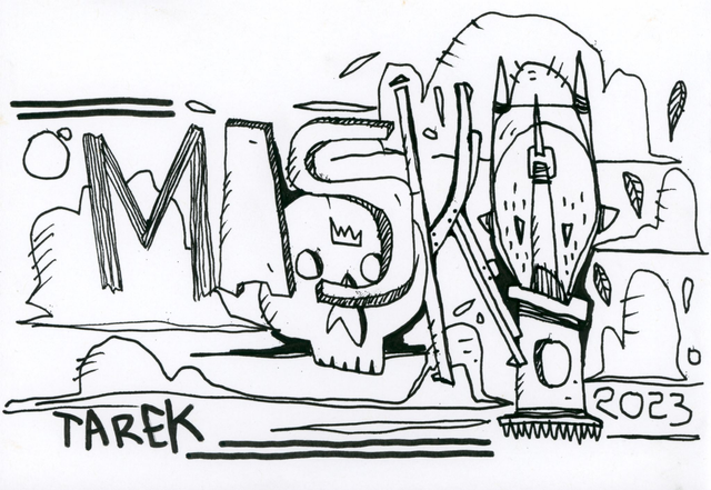 Posca sur Papier, 21x15cm // L’idée de customiser des masques ou d'en peindre n’est pas récente dans le travail de Tarek puisque il avait déjà réalisé quelques pièces dès 2010. Lors de son séjour au Cameroun, en 2017, il a peint des murs dans des écoles au ministère du tourisme. Il a également partagé sa passion avec d’autres peintres camerounais qui ont participé aux fresques murales. Sur place, il a pu faire l'acquisition de nombreux masques africains qui ont été des sources d'influence pour son travail. De retour en France, il a customisé une partie de ceux-ci et peint une grande série de toiles intitulée Masque(s) exposée à la galerie Philippe Gelot (Paris 4e) et à la galerie Kvasnevski (Paris 17e). Ce thème lui tient à cœur depuis longtemps que ce soit en peinture, en bande dessinée ou encore en muralisme.