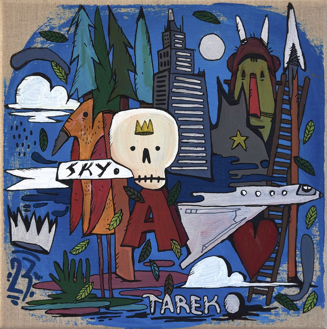 Poscas et acrylique sur toile, 30x30cm, 2023 // Vincit Omnia Vanitas est une série qui regroupe une partie des œuvres de Tarek consacrée aux Vanités, aux "Skull" et aux crânes dans des mises en scènes modernes. Durant une dizaine d'années, il a collé régulièrement des skulls customisés mis en couleur dans les villes où il se rendait… Les collages de Skulls ont été posés dans la rue en plein jour. Chaque objet peint était signé. Avant le collage, une photographie de l’objet était systématiquement prise dans un endroit avec un minimum de mise en scène. Villes où des collages ont été effectués : France (Agen, Arras, Bourges, Chauny, Gentilly, Ivry-sur-Seine, Laval, Lorient, Lurcy-Levis, Marseille, Merlieux, Montrouge, Moulins, Niederbronn, Pacé, Paris, Puteaux, Rennes, Saint-Malo, Saint-Denis, Saint-Ouen et Valenciennes), Athènes, Bruxelles, Montréal, New York et Rabat.