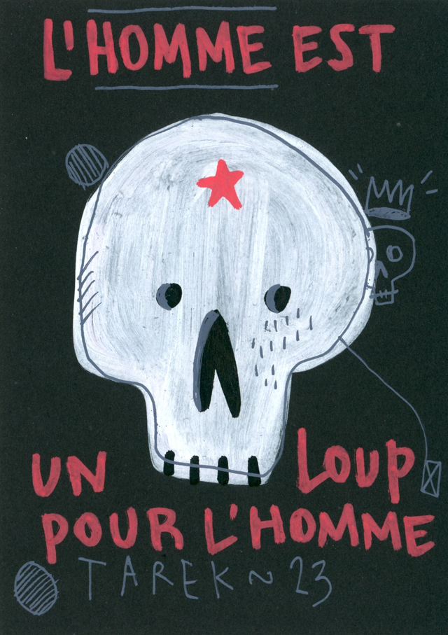 Posca sur Papier, 21x15cm // Vincit Omnia Vanitas est une série qui regroupe une partie des œuvres de Tarek consacrée aux Vanités, aux "Skull" et aux crânes dans des mises en scènes modernes. Durant une dizaine d'années, il a collé régulièrement des skulls customisés mis en couleur dans les villes où il se rendait… Les collages de Skulls ont été posés dans la rue en plein jour. Chaque objet peint était signé. Avant le collage, une photographie de l’objet était systématiquement prise dans un endroit avec un minimum de mise en scène. Villes où des collages ont été effectués : France (Agen, Arras, Bourges, Chauny, Gentilly, Ivry-sur-Seine, Laval, Lorient, Lurcy-Levis, Marseille, Merlieux, Montrouge, Moulins, Niederbronn, Pacé, Paris, Puteaux, Rennes, Saint-Malo, Saint-Denis, Saint-Ouen et Valenciennes), Athènes, Bruxelles, Montréal, New York et Rabat.