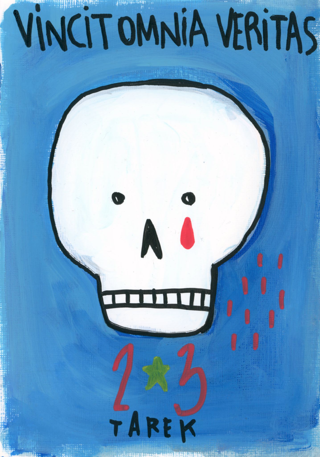 Poscas et acrylique sur Papier toilé, 15x22cm // Vincit Omnia Vanitas est une série qui regroupe une partie des œuvres de Tarek consacrée aux Vanités, aux "Skull" et aux crânes dans des mises en scènes modernes. Durant une dizaine d'années, il a collé régulièrement des skulls customisés mis en couleur dans les villes où il se rendait… Les collages de Skulls ont été posés dans la rue en plein jour. Chaque objet peint était signé. Avant le collage, une photographie de l’objet était systématiquement prise dans un endroit avec un minimum de mise en scène. Villes où des collages ont été effectués : France (Agen, Arras, Bourges, Chauny, Gentilly, Ivry-sur-Seine, Laval, Lorient, Lurcy-Levis, Marseille, Merlieux, Montrouge, Moulins, Niederbronn, Pacé, Paris, Puteaux, Rennes, Saint-Malo, Saint-Denis, Saint-Ouen et Valenciennes), Athènes, Bruxelles, Montréal, New York et Rabat.